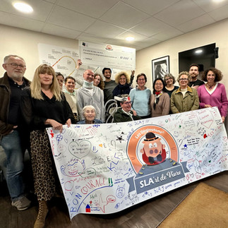 En présence de Lynne, Lenny et Michel, Les Dégloutons sont très heureux et fiers de remettre pour la 2ème fois en 2 ans un chèque de 10.000 euros à l’ARSLA à la suite de l’évènement le SLA'rt de Vivre.